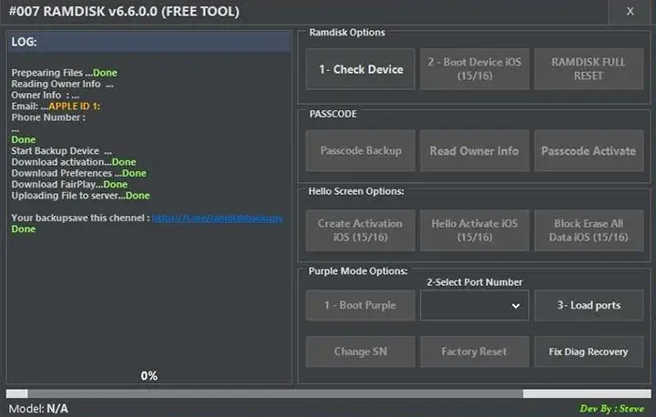 Unlock your iPhone or iPad (iOS 12–16.5.1) from the iCloud activation lock for free! #007 Ramdisk Tool v6.6.0.0 offers easy-to-use features like DFU mode, passcode backup, Hello screen customization, purple...