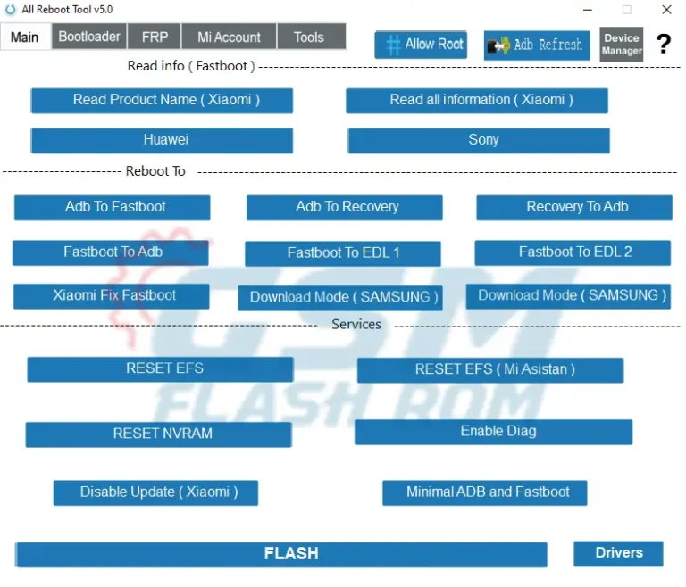 All Reboot Tools v5.0 including bootloader and root access, device manager functionalities, Read Product Name for Xiaomi devices, Xiaomi Fix Fastboot, Download Mode 300k for Samsung devices, RESET EFS/NVRAM services, Mi Account Bypass capabilities and various tools such as LZ4 To IMG Converter (32 Bit/64 Bit), APK installer, etc. The software also offers FRP, Unlock Bootloader features for Old Xiaomi Qualcomm (Fastboot Mode), Redmi Note 8/8T How To Unlock Bootloader methods, and other popular tools like TR TOOLS PRO, DFT PRO, and UMT. Furthermore, it has the ability to read all necessary information from different vendors’ phones such as Huawei/ Sony/ HTC+Vestel Venus & Micromax Yu Yuphoria in Fastboot mode.