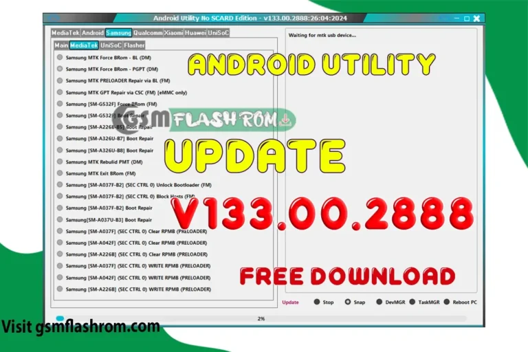 The latest Android Utility v133.00.2888, releases new Samsung boot repair and unlock features for MTK and Unisoc chipsets. Unlock bootloaders, force BRom modes, rebuild PMT, and more. Download the MTK...