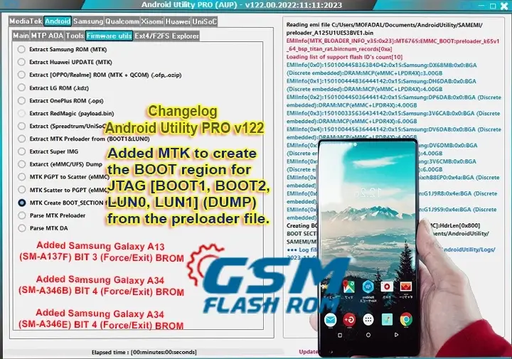 Enjoy the latest update for Android Utility PRO (AUP) with new features and improvements. v122.00.2022:11:11:2023 creates a BOOT region for JTAG on MTK devices,