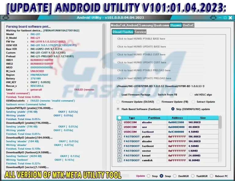 Our software now supports Huawei MTK devices for META mode operation, with [Board/Debug] SW mode required. Additionally, we have added a Fast-boot Flash partition option (BL unlocked [kernel/debug] mode required) for faster performance.
