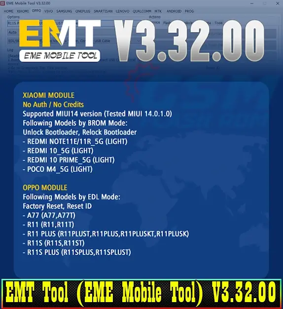 Download EMT v3.32.00 (EME Mobile Tool) Support Unlock/Relock Bootloader, Factory Reset, and Reset ID for Redmi NOTE 11E/11R_5G (LIGHT), Redmi 10_5G (LIGHT), Redmi 10 PRIME_5G,, and POCO M4_5G (LIGHT) Xiaomi models; as well as A77 (A77, A77T), R11 (R11, R11T), R11 PLUS (R11PLUST, R11PLUS, R11PLUSKT, R11PLUSK), R11S (R11S, R111ST),, and R11S PLUS (R102SPK). We have also updated solutions for the MIX model with MIUI 9, 10, and 11 reset ID solutions, improved time-outs per module up to 180 seconds, and made additional improvements such as fixing known bugs.
