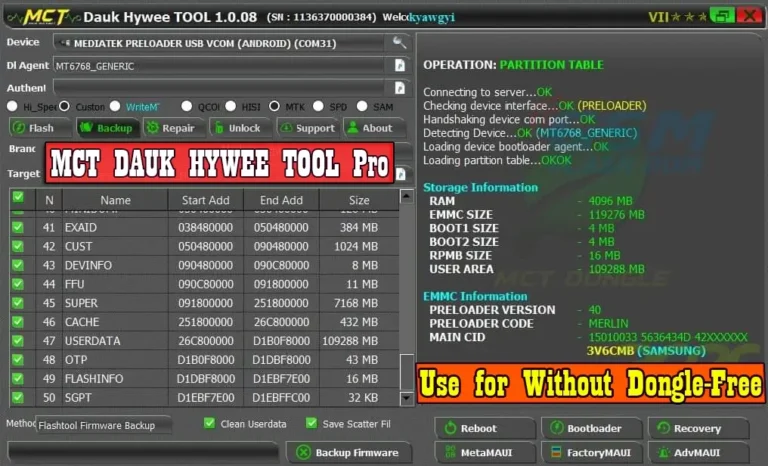 The latest version of the MCT Dauk Hywee TOOL Pro v1.0.08 is now available for download, and you won’t need a MCT DH Tool dongle. This powerful tool can be used for flashing, backing up, unlocking, repairing, forensic work and more!