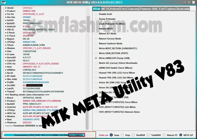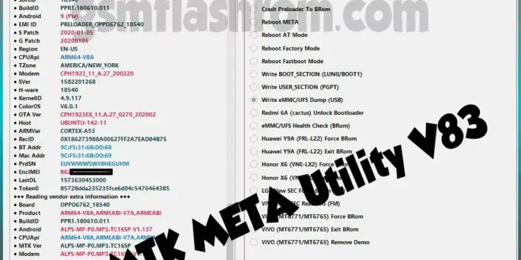 MTK META Utility V83 is a Windows: small mobile tool Support Samsung UNISOC Flash PAC file via Boot ROM mode (SPRD U2S Diag) MTK Brom Bypass feature Support Unlock Network (META), Factory Reset – META, VIVO New SEC Read info, Disable Auth, remove user data screen lock reset FRP lock some supported MTK Auth bypass Model.